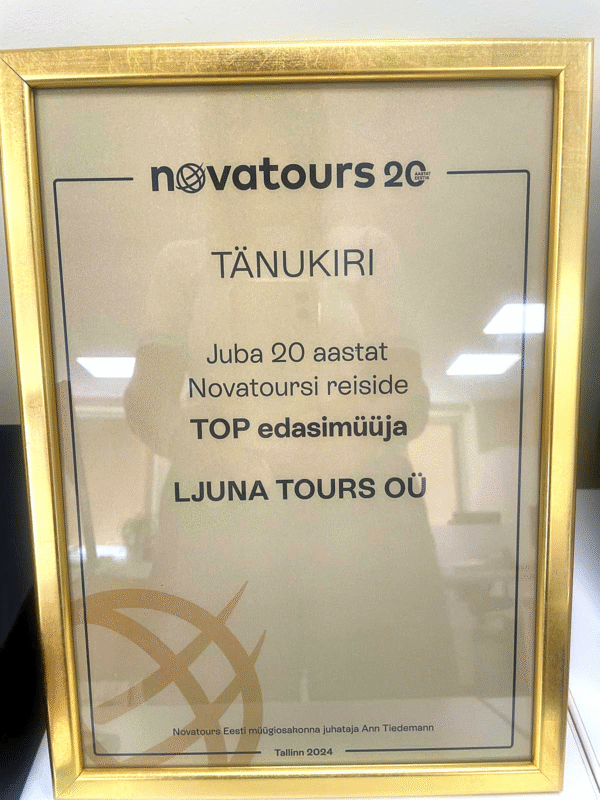 Ljuna Tours pälvis tänukirja ja tunnustuse kui Novatoursi reiside TOP edasimüüja – see on suur tunnustus meie järjepidevale tööle, kvaliteetsele teenindusele ja klientide usaldusele. Täname Novatoursi meeskonda usalduse ja koostöö eest nende aastate jooksul! Liigume koos edasi uute saavutuste suunas!